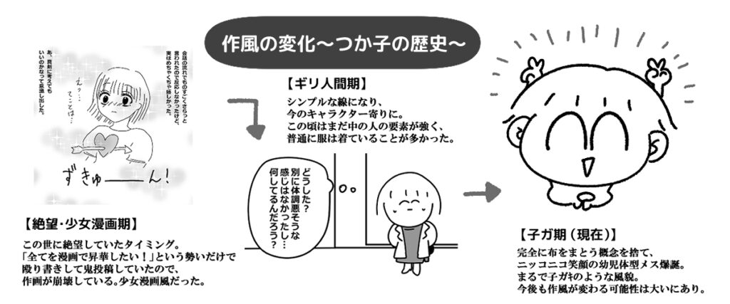 アラサー/裸族/メスという肩書きを背負い、主にInstagramとブログでエッセイ漫画を投稿しています。中の人と「つか子ちゃん」というキャラクターの線引きは正直曖昧ではありますが、あくまでつか子ちゃんは、中の人が「こうありたい」という理想を投影したキャラクターになりますので、実際の人物とは見た目もキャラクターも異なります。