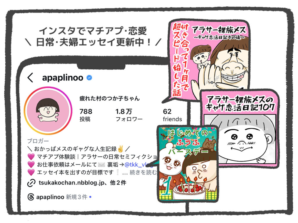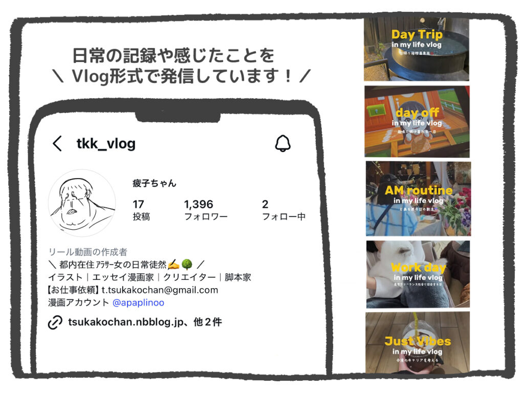 SNSでは「疲れた村のつか子ちゃん」のサブアカウントを運用しており、漫画とはまた別視点でのリアルなアラサー女の考えや、意地でも就職したくない社不なのでフリーランスで生き伸びるためにしていること、なんかキラキラしきれていないライフスタイルなどを、文章や映像で発信。